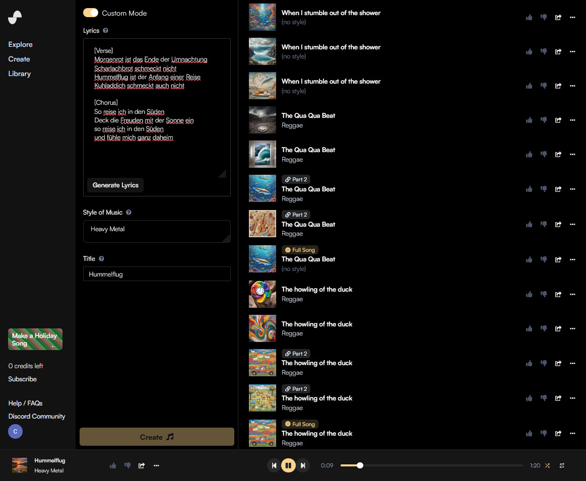 Bitte beachte, das isch nit öppis wo ein in der Nachbearbeitig stundelang dra umegschrubt het, bis es so tönt wies söll, sondern das sind automatisch generierti Songs us custom Lyrics und Agab voder gwünschte Stilrichtig.